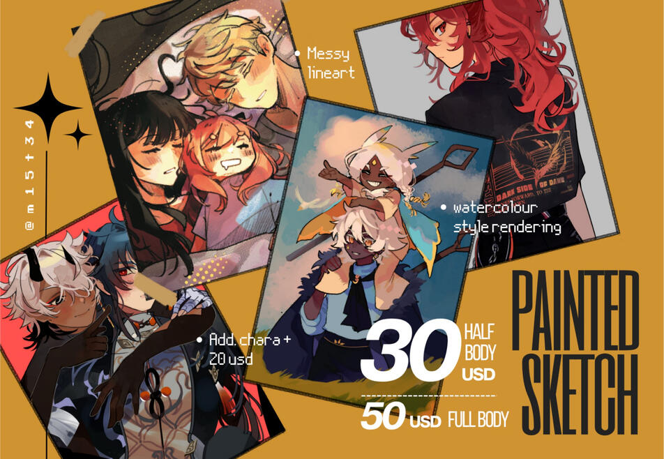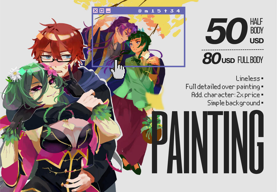 TERMS AND CONDITIONS:DISCLAIMER: I can NOT guarantee a specific time of wait as I'm a university student and tend to have exams and research work to do (also really bad inetrnet :') ), but I'll always reply and communicate regarding your commission.- Time: For simpler commissions I tend to take around 2-3 weeks but for bigger comms with more details, those can go up to 4 weeks to 2 months.- Use: All commissions here are for PERSONAL USE ONLY unless stated separate payment has been made for Commercial use.- Refunds: No refunds, if I've already started working on your commission (you have approved a preliminary sketch).- Process: You are required to send me proper references of your character (and any pose refs or moodboards if you'd like!) Upon accepting the commission, I will work on a preliminary sketch that you will review and let me know if there's any changes to be made etc. After approval I'll head towards finishing it.- DOs and DONTs: